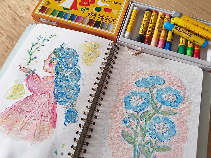I have started with the ones that, in my opinion, I find the most challenging to use. They are called oil pastels (cray-pas), from the Sakura brand. Although they look very fancy on paper, they actually remind me of the Manley crayons but in cute little boxes.